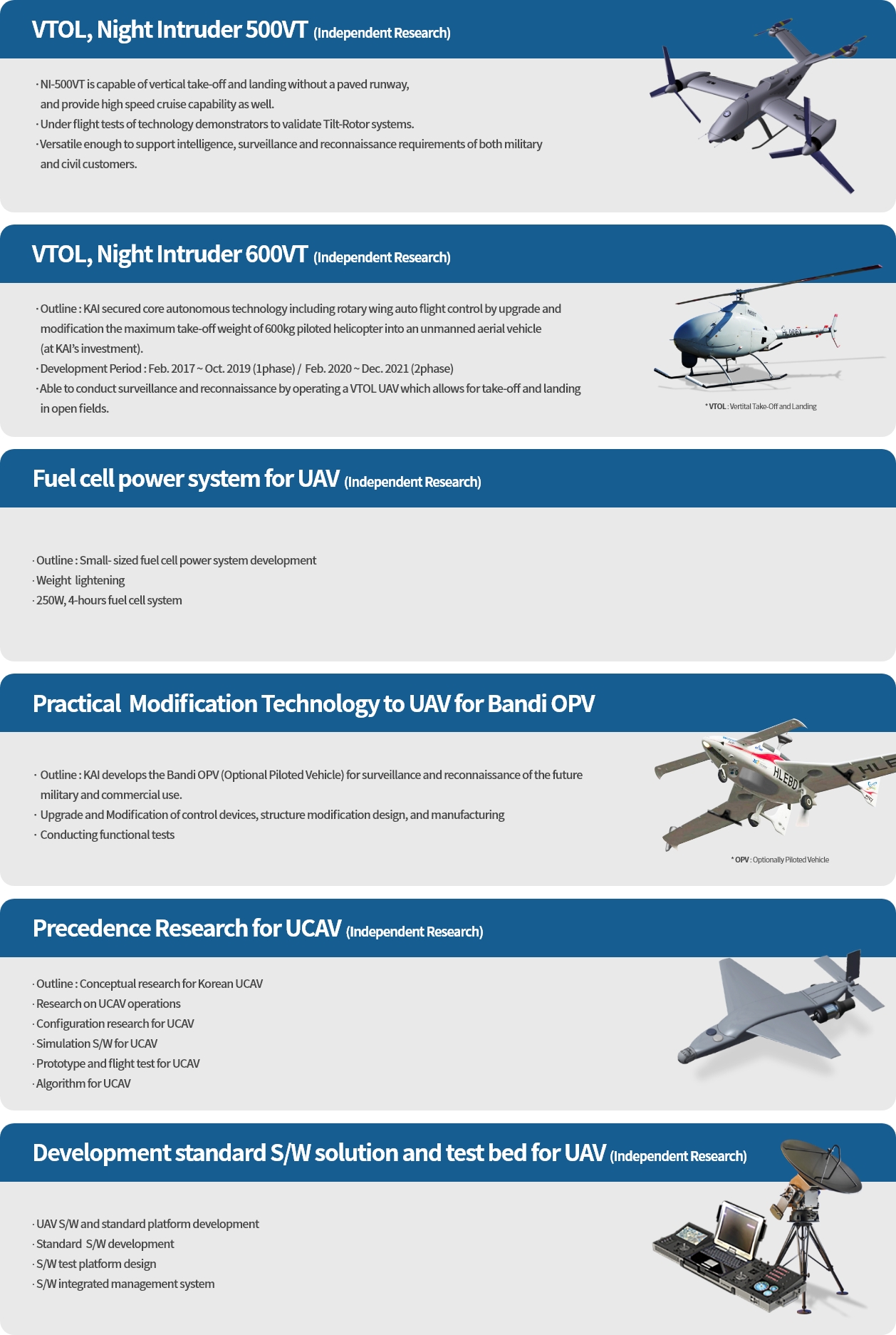 Based on it, KAI continues to conduct advance research on VTOL(Vertical Take-Off and Landing) UAV, Strike-typed UAV and UCAV(Unmanned Combat Aerial Vehicle), leading the way in developing the technology for autonomous systems.