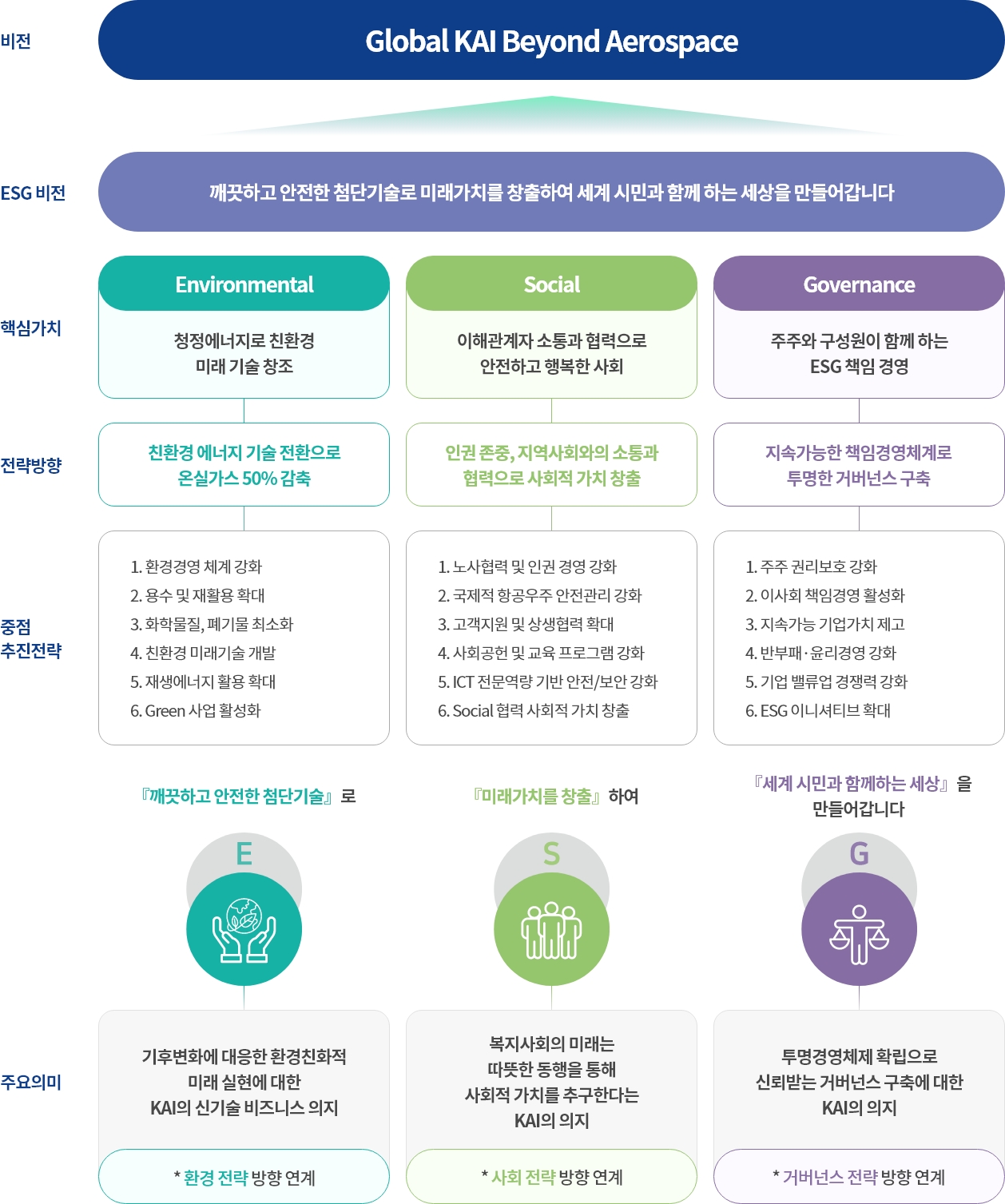 환경, 사회, 거버넌스 각 분야의 핵심 가치와 전략 방향을 주축으로 중장기적 관점에서 6가지 중점 추진전략을 수립하여