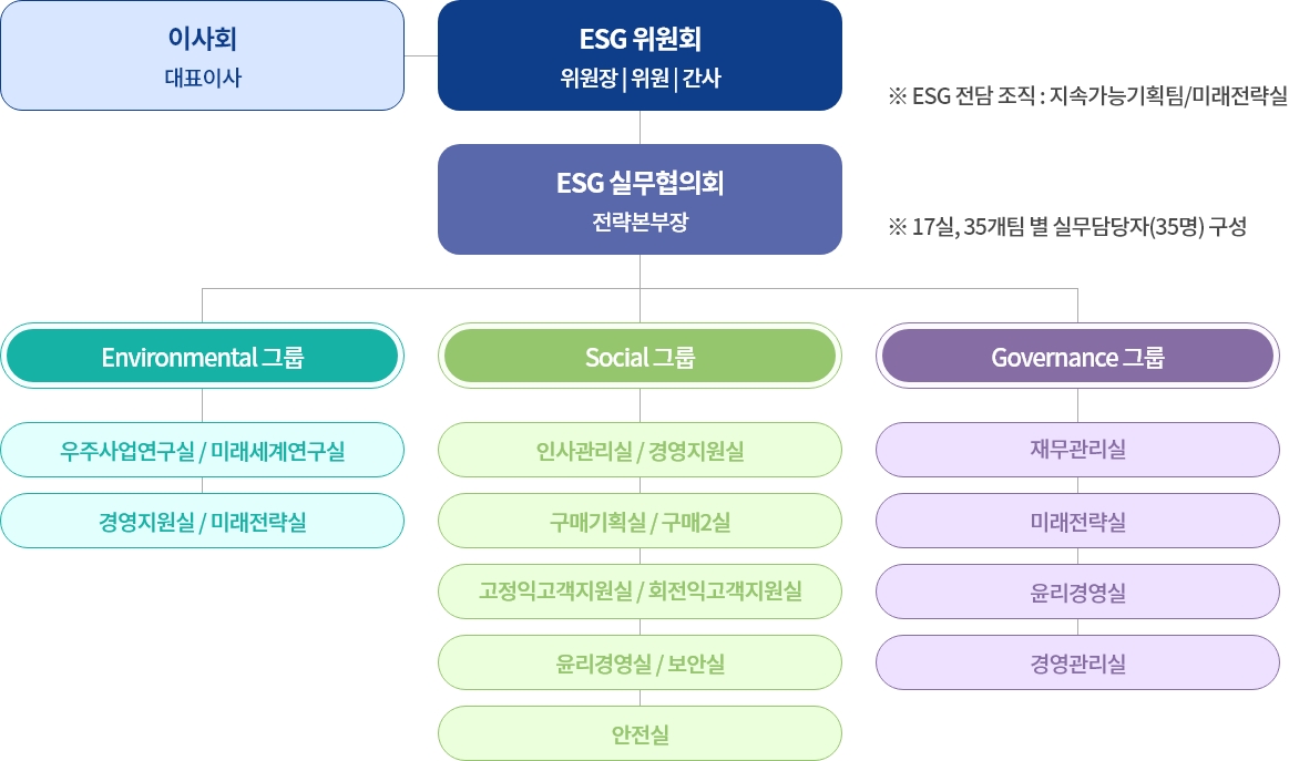 ESG 실무협의회는 전략본부장을 의장으로 관련 조직 17실 35개 팀으로 구성된 사내 협의체입니다.