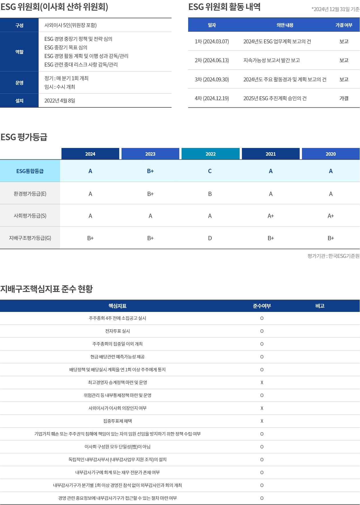 ESG위원회는 분기별 1회 개최되며, 필요에 따라 임시위원회를 수시로 개최할 수 있습니다.